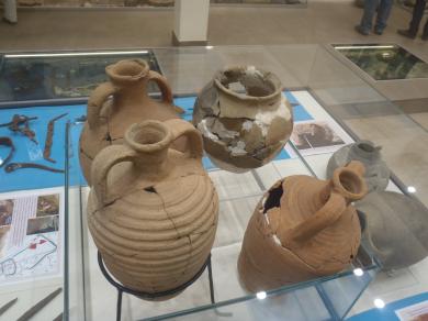 Директор музея Ирина Шрамко называет интересные вещи, которые здесь можно увидеть: костяной псалий, ядра для метательной машины, фибулы — застежки для плаща, стеклянные кубки и монеты, римский сервиз, литейные формы для украшений, ойнахоя — расписной кувшин, восточное зеркало, казацкие трубки, навершия для лука с изображением зайца и сосуд с нарисованными на нем людьми с копьями. Но среди этих экспонатов выделяется объект необычного жертвоприношения — скелет пса с ожерельем из фаянсового бисера на шее.