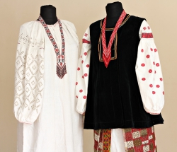 И начнем с наиболее древней выставки, древней по экспонатам, конечно. Эта выставка называется «Полтавская старина». Открыта она в выставочном зале музея и представляет собой коллекцию народной одежды и вышивки из коллекции Ларисы Григорович. Хотела бы подчеркнуть: коллекция именно народной одежды и народной вышивки. Эта коллекция собиралась в течение 45 лет и называется «Полтавская старина» не случайно, потому что сама Лариса Лазаревна жила на Полтавщине в городе Лубны, окончила Харьковский медицинский институт, работала в Запорожье педиатром, но очень увлеклась народной вышивкой. Увлечение, если немного знать историю этой семьи, не было случайным, потому что и ее мама, и бабушка дома всегда ходили в народной одежде, сшитой и вышитой своими руками. А Лариса со временем не просто увлеклась, а начала ходить, ездить по окрестным селам и собирать всевозможные образцы вышивки и одежды разного кроя — те, которые сохранились, разумеется. Сейчас на выставке более ста предметов. Здесь как рушники представлены, что уже, в общем-то, достаточно хорошо знакомо нашему зрителю, так и сорочки, корсетки, юбки и другие предметы одежды. Кстати, мы очень благодарны нашему оперному театру, который помог нам с предоставлением оборудования — манекенов, потому что просто прикрепить иголочками к стенду одежду, согласитесь, не очень интересно, а когда она на манекенах, когда обретает объем, на нее можно смотреть с восторгом! Вот просто годами, десятилетиями, а может быть, и столетиями рассматривать отработанные приемы кроя, формирования, допустим, буфов рукава или размещения вышивки на рукаве, на груди. Иногда это очень скромные вещи, но выполненные с удивительным вкусом. Действительно, ничего лишнего в народной одежде нет. А отбор этот вкусовой обусловлен отбором деталей. Несложно догадаться, что эта выставка показывает, какими совершенно изумительными мастерами были самые обыкновенные сельские девушки, женщины. В представленных на выставке экспонатах можно увидеть разнообразные мережки, гладь, так называемое вырезывание, выкалывание — «соловьиные глазки», «курячий брод» и т. д. Их десятки, различных техник, которые здесь, в этой народной работе, народном искусстве покорят душу любой модницы. Нужно сказать, что и сама Лариса Григорович очень много вышивает, вышивка у нее ручная, а вещи, ею исполненные, сейчас находятся в частных коллекциях многих стран мира: Италии, Норвегии, США, Польше, Чехии, России, Германии, Франции — в странах, в которых очень ценят народную вышивку, ручную работу, и эта выставка как раз и привлекает своим живым дыханием, дыханием мастерицы, которая сидела и вышивала долгими вечерами. Вышивка ведь требует внимания, покоя, какого-то определенного настроения, иногда, может быть, даже уединения, и поэтому все эти вещи, они как бы одухо­творены. Сейчас очень много пользуются приемами машинной вышивки. Да, это очень красиво, может быть, более геометризировано, может быть, так сказать, более правильно, строго и четко рисунок выполнен, но в том-то и отличие народной ручной вышивки от машинной, что в народной вышивке всегда играет роль фактура, а цвет подбирается индивидуально каждой мастерицей. Да! И красили-то как?! Нитки обрабатывали тогда только природными красителями, поэтому эти вышивки отличаются особым благородством. Ну и здесь ж