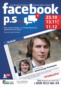 “Это спектакль о любви в соцсети. На сцене будет находиться экран, на котором отображается лента Facebook, и хотя актер на сцене один (это one man show ), создается полная иллюзия, что он вместе со своей любимой и с друзьями”, – отметили авторы. По их словам, это “спектакль, в котором зритель участвует в игре с первой минуты. Спектакль – рассказ о современном человеке в виртуальном мире, полном смешных реальностей, где аватары становятся ближе, чем реальные друзья, а самая большая радость – еще один “лайк”.