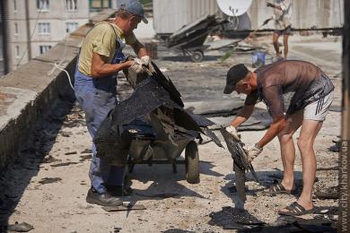 На примере 12-этажного жилого дома по пр. Московскому 250В, где уже неделю идет капитальный ремонт кровли, директор предприятия объяснил правила защиты крыши. «Рабочие разбирают старую кровлю, вместо нее заливают цементную стяжку и кладут два слоя нового коврового покрытия. Крышу нужно убирать от грязи, чтобы водоприемные воронки не забивались». Площадь дома 1600 м2, на его ремонт выделено 310 тыс. грн. Работы планируют закончить10–15 июля, так как стандартные сроки выполнения капремонта крыш — месяц. Сейчас сделано 20 % работы — вырубка-стяжка, а это самый тяжелый процесс. Рабочие, 3–5 человек, не отдыхают даже в жару, прерываясь только на обед.