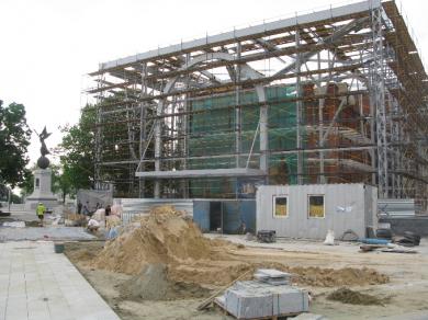 Ко Дню города архитекторы и строители спешат выкрасить музей в золотистый цвет и застеклить пристройку в виде куба, чтобы приступить к внутренним работам.