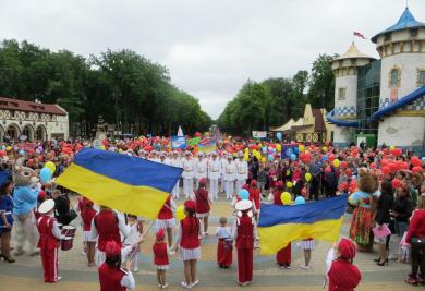 Под ритм ударных школьники, воспитанники интернатов, детских домов и центров реабилитации, а также участники творческих коллективов города и области прошагали по центральной аллее парка с разноцветными воздушными шариками и флагами Украины в руках.