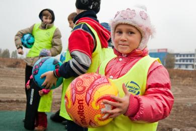 После торжественной части детям переселенцев вручили мячи и ракетки для бадминтона.