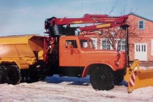 Песок грузят с помощью установленного за кабиной манипулятора-экскаватора, произведенного в Германии. Машина собрана на базе “КРАЗа” 1973 года выпуска.