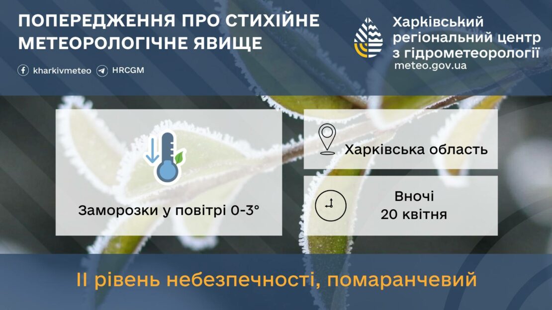 За прогнозом Харківського обласного гідрометцентру, вночі 20 квітня по області очікуються заморозки у повітрі 0 – 3°.