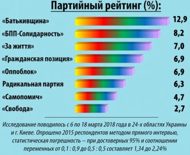 Так, если бы выборы в Верховную Раду Украины проходили на следующей неделе, большинство избирателей отдали бы свои голоса за Всеукраинское объединение «Батьківщина» (12,9 % респондентов). На втором месте оказалась бы партия «Блок Петра Порошенко «Солидарность»» (8,2 %). На третьем месте — партия «За життя» (7 %).