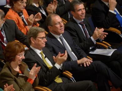 «Только что с этой трибуны выступал председатель Евросовета господин ван Ромпей. Он заявил, что народ Украины должен сделать свой выбор, но тут же добавил, что сам он уверен, что будущее Украины – в Евросоюзе. Выступал здесь и мой друг, генеральный секретарь НАТО Андерс Фог Расмуссен, который тоже говорил о необходимости предоставить Украине свободу выбора. Но мы все помним, как в 2007 году на саммите НАТО этот выбор был за Украину предопределен, но потом все-таки здравый смысл восторжествовал. Приведу также слова официального представителя Государственного департамента США, что Соединенные Штаты рассчитывают на формирование на Украине правительства, которое обеспечит политическое единство и экономическое процветание, поддержанное МВФ и отвечающее чаяниям украинского народа на европейское будущее», – отметил Лавров.