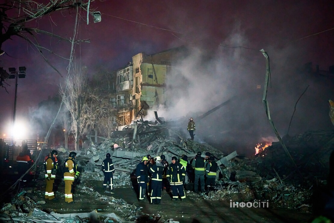 Рятувальники та комунальники продовжують роботи з розбору завалів. Задіяні кінологічні розрахунки ДСНС та Червоного Хреста. Попередньо, під завалами ще є люди.