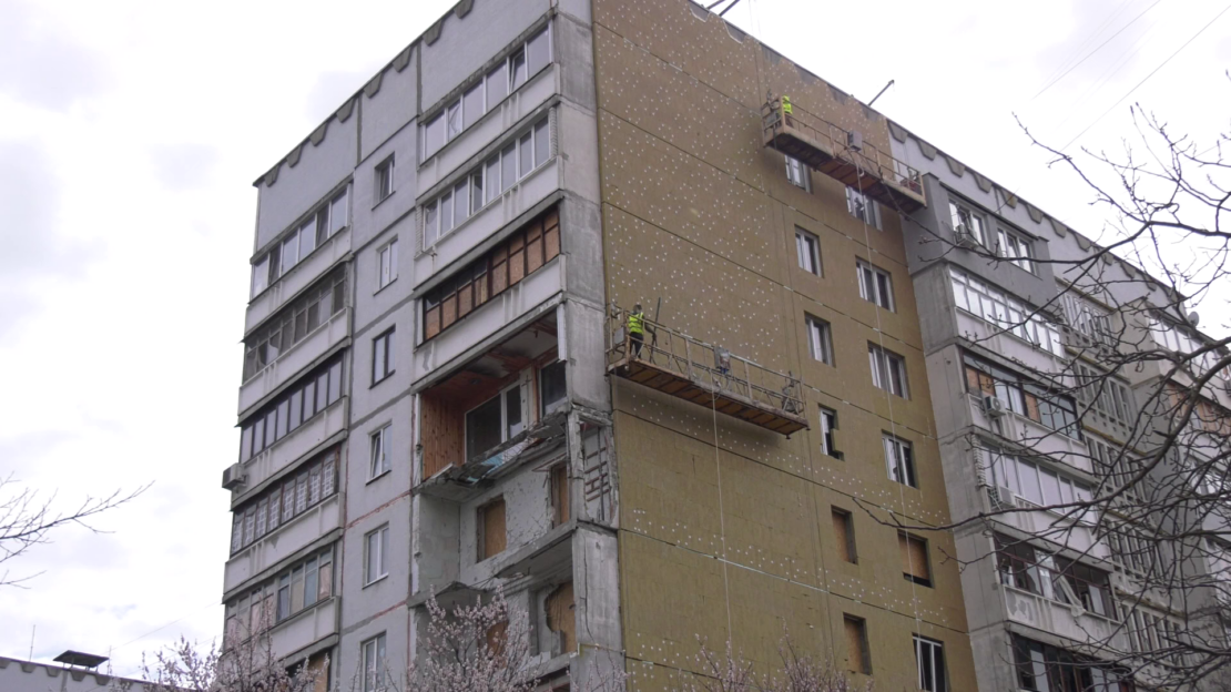 На цей час демонтовані аварійні панелі, які просто висіли після вибухів, і на їх місці збудовані нові конструкції стін. Вони утеплюються, встановлюються вікна. Замонолітені отвори в покрівлі, які утворилися в результаті влучань, і там вже встановлено нову покрівлю. Попереду ще заміна ліфта, зокрема у другому під’їзді, опорядження пошкоджених квартир, відновлення балконів. Поступово ми відновлюємо цей будинок.
